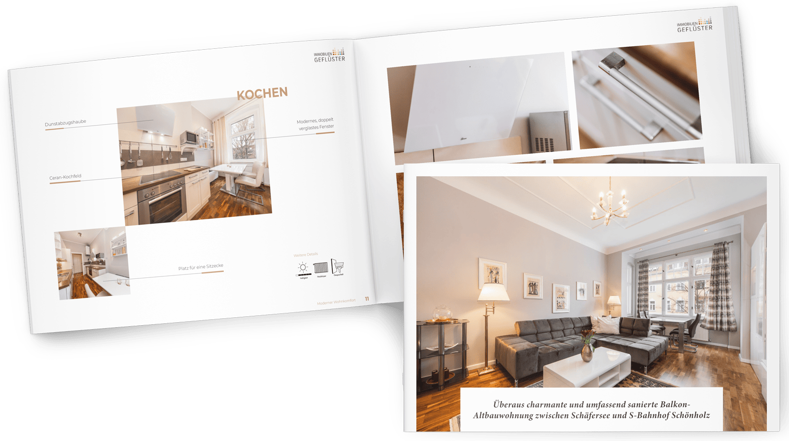 Unsere beliebten Exposés schaffen eine einzigartige Erlebniswelt, die emotional begeistert und sachlich überzeugt. So werden aus losen Anfragenden interessierte und informierte Besichtigende. Für Sie bedeutet das: Weniger Erklärungen, weniger Immobilientouristen und mehr wahrgenommener Wert Ihrer Immobilie.